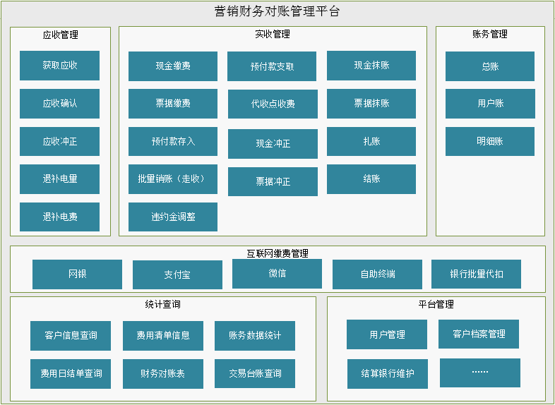 營銷財(cái)務(wù)對(duì)賬管理平臺(tái)為企業(yè)繳費(fèi)結(jié)賬、與財(cái)務(wù)實(shí)現(xiàn)自動(dòng)化對(duì)賬提供了統(tǒng)一標(biāo)準(zhǔn)、服務(wù)與接口,滿足傳統(tǒng)實(shí)體營業(yè)廳、自助服務(wù)終端、銀行代扣到微信、支付寶互聯(lián)網(wǎng)等繳費(fèi)方式統(tǒng)一接入平臺(tái),支撐企業(yè)財(cái)務(wù)統(tǒng)一對(duì)賬管理,推動(dòng)企業(yè)為客戶提供快速、高效、便捷服務(wù),提升企業(yè)賬務(wù)管理水平。