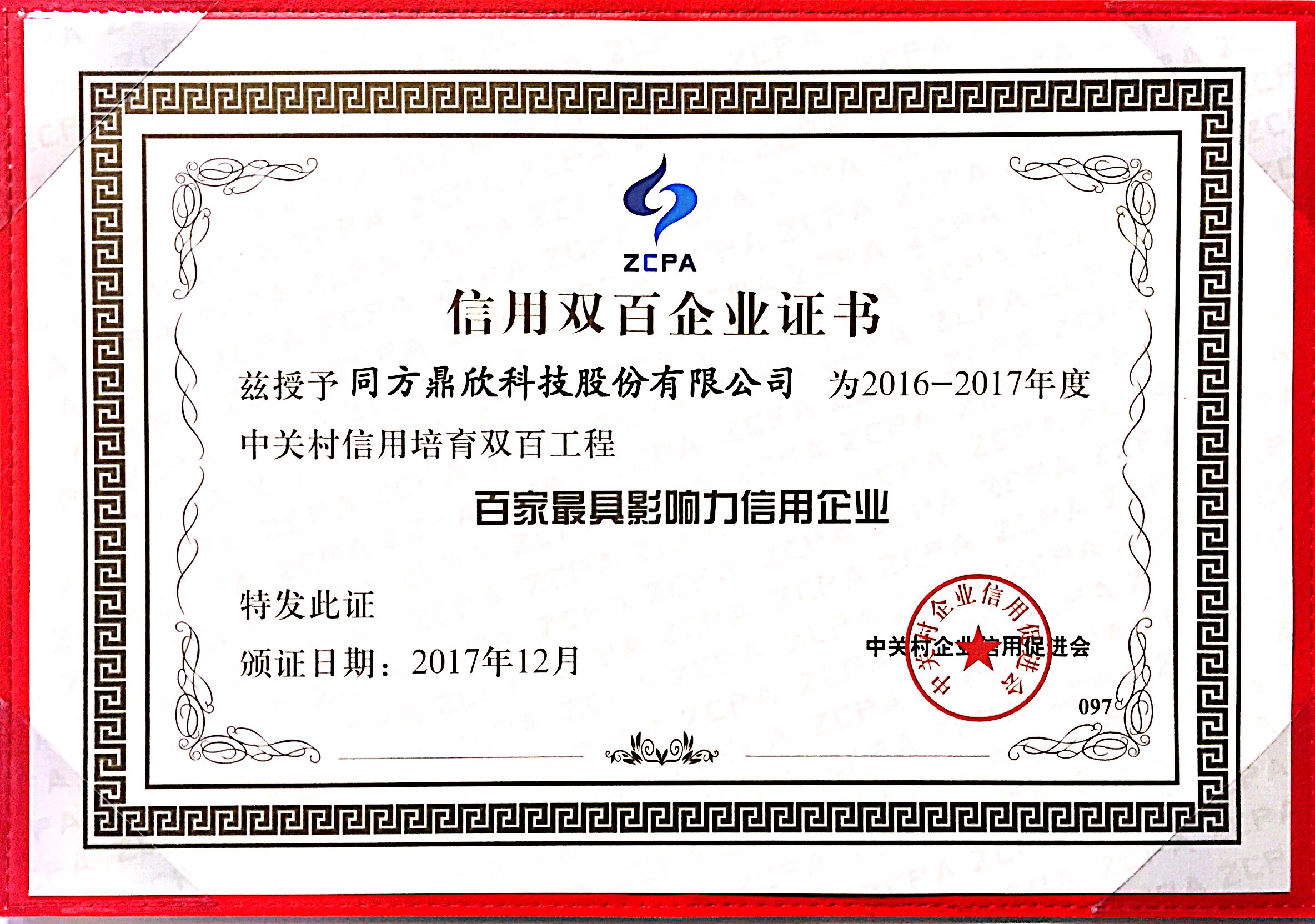 該獎項由中關村管委會主管、中關村信用促進會組織發起,獎項分為“百家最具發展潛力信用企業”和“百家最具影響力信用企業”兩類進行表彰。同方鼎欣作為企業代表受邀出席本次會議,并依托自身品牌實力、技術優勢和創新能力上榜《2017中關村信用雙百企業評選活動》企業名單。設置該獎項是為了聚集中關村科技金融資源,服務企業融資發展,讓企業更加注重自身的信用建設和信用管理的評選活動。公司從千余家參選企業中脫穎而出,獲得百家最具影響力信用企業殊榮,是對同方鼎欣誠信經營理念的最大認同和鼓勵。