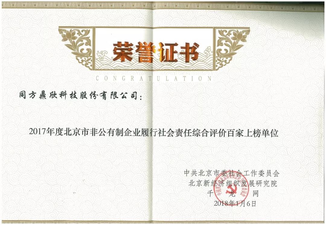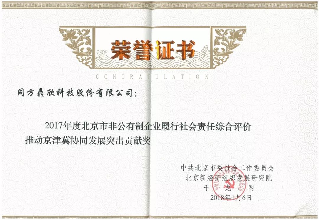 會上對100家“2017年度北京非公有制企業履行社會責任綜合評價百家上榜”單位、50家“2017年度北京非公有制企業履行社會責任專項獎”單位和10家“2017年度北京非公有制企業履行社會責任評價活動組織獎”單位進行頒獎。評選標準包括保障員工權益、誠信生產經營、維護國家利益、參與社會公益四個維度的28項指標。同方鼎欣憑借多年格遵守行業相關法律法規,誠信經營獲得《2017年北京市非公有制企業履行社會責任綜合評價百家上榜單位》《2017年北京市非公有制企業履行社會責任綜合評價推送京津冀協同發展突出貢獻獎》兩項殊榮!