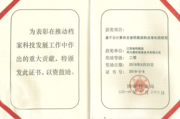 江西省檔案局為江西省省委、省政府直屬廳級事業(yè)單位,負責對全省檔案事業(yè)實行統(tǒng)籌規(guī)劃、宏觀管理,組織開展全省檔案理論和科學研究,推進全省檔案工作的科學化、標準化和現(xiàn)代化建設(shè)。同方鼎欣擁有豐富的國家機關(guān)單位檔案管理系統(tǒng)軟件開發(fā)與實施經(jīng)驗,自2012年與江西省檔案局首次合作以來,同方鼎欣采用自主研發(fā)檔案管理系統(tǒng),為江西省檔案局實現(xiàn)了檔案數(shù)字化管理,我們研發(fā)的系統(tǒng)具備穩(wěn)定性、實用性、規(guī)范性、先進性的特點,能有效地解決現(xiàn)有政務(wù)系統(tǒng)檔案收、管、存、用的難題。 公司開發(fā)的資料共享利用平臺于2016年獲得了“國家檔案局優(yōu)秀科技成果二等獎”的殊榮。