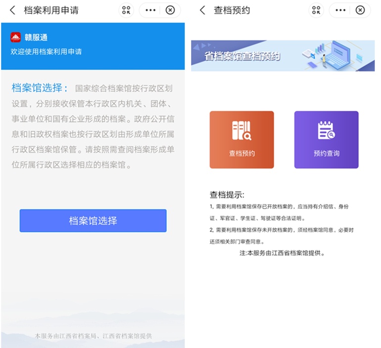 群眾通過手機(jī)“贛服通”APP或“支付寶”APP的“贛服通”小程序,僅需經(jīng)過選擇檔案館、人臉識別認(rèn)證、填寫申請表單的簡單幾步,就可方便快捷的提交查檔利用申請,并獲取檔案電子證明件,有需要的查檔者還可通過郵政快遞獲取紙質(zhì)檔案復(fù)制件。
