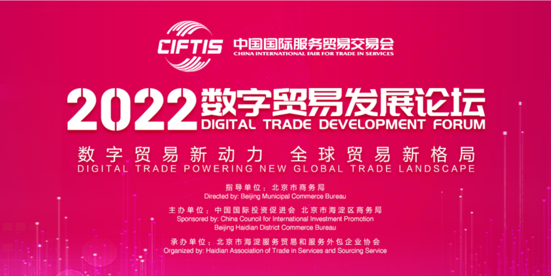 作為2022年服貿會的分論壇,“2022數字貿易發展論壇”是由中國國際投資促進會、北京市海淀區商務局主辦,北京市海淀服務貿易和服務外包企業協會承辦。作為海淀區在服貿會的主要分論壇,也是推進海淀區數字貿易港建設的重要國際交流平臺,本論壇緊跟我國數字貿易發展趨勢以共同構建數字經濟生態圈為目標,圍繞“數字技術賦能綠色經濟”的主題,與來自國內外嘉賓及行業客戶進行交流對接。