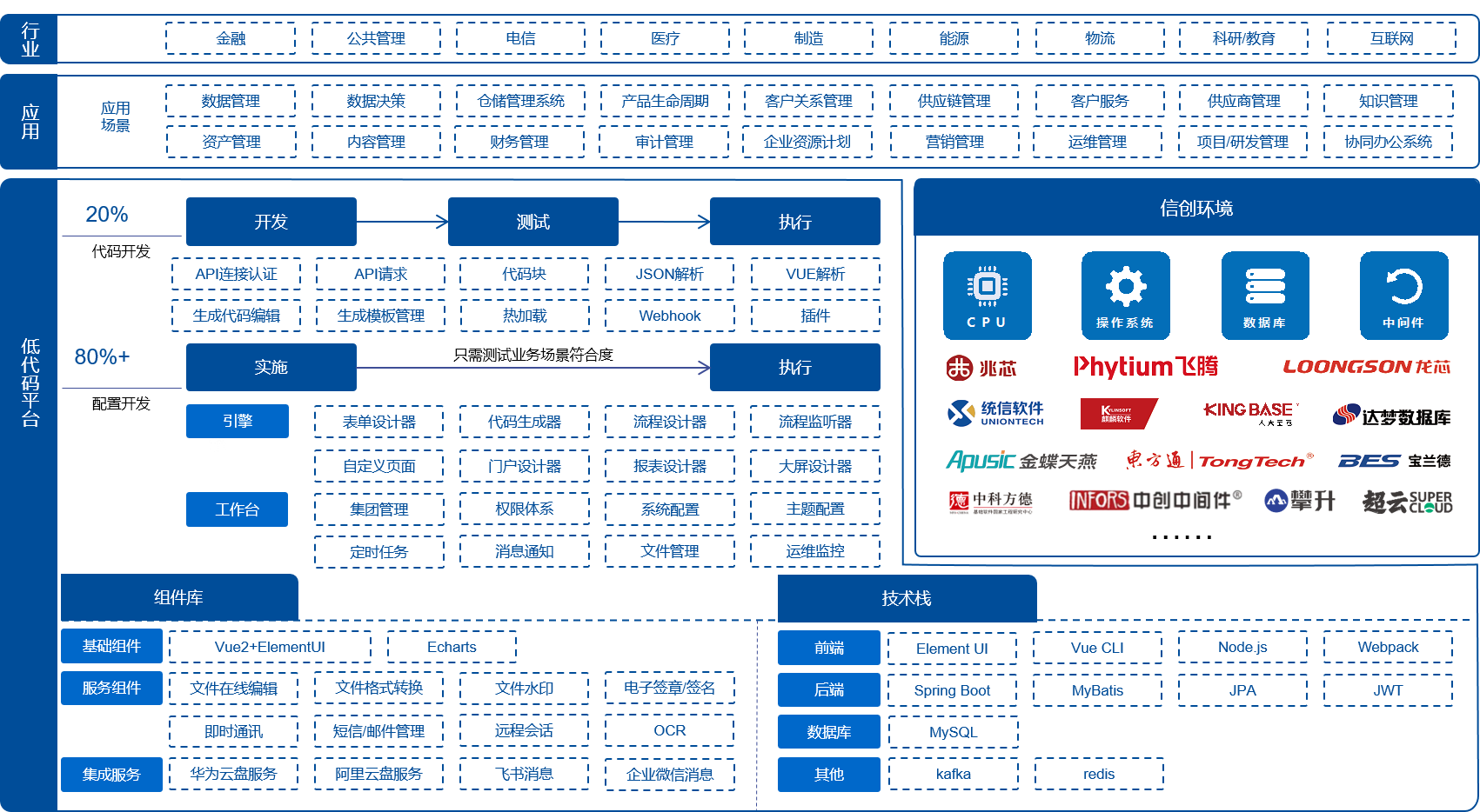 本平臺為將信創落實到實處,堅持?主創新,注重國產化信創環境的適配。操作系統是信息安全產業底層中?,本平臺與多款主流國產操作系統適配,如統信操作系統、麒麟操作系統;同時內置接?,可以快速友好的同其他IT系統或智能硬件進?整合,并?持主流國產數據庫達夢、?斯等。 可實現由0-1的定制核心業務應用系統搭建、舊系統的數據遷移和換新,并可統一承接、快速搭建非核心的業務模塊。可用于IT運維管理平臺、檔案管理系統、OA系統等眾多應用場景。