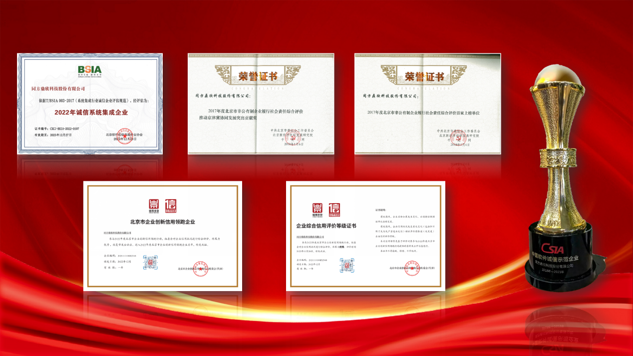 作為北京軟件和信息服務業協會會員企業,同方鼎欣深耕信息產業領域二十余年,業務輻射全國50多個主要城市,覆蓋醫療健康、數字檔案、移動通信、金融保險、公共服務等眾多行業領域,可為全球客戶提供管理咨詢、定制開發、運行維護、系統集成等專業的IT服務,通過全方位的信息技術服務助力客戶實現數字化轉型和升級,是我國推進行業數字化轉型的先行者之一。多年來,公司始終秉持“創新、進取、誠正、務實”的價值理念,以誠信經營的契約精神為客戶提供優質的產品、專業的技術、細致的服務,在企業誠信方面先后獲得了北京市企業創新信用領跑企業、誠信系統集成企業、中國軟件誠信示范企業、北京市非公有制企業履行社會責任綜合百家上榜單位、北京市非公有制企業履行社會責任綜合評價推動京津冀協同發展突出貢獻獎等諸多政府、行業的榮譽認證。