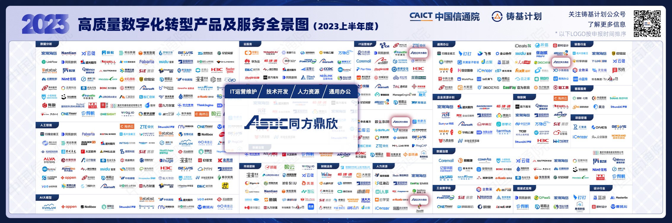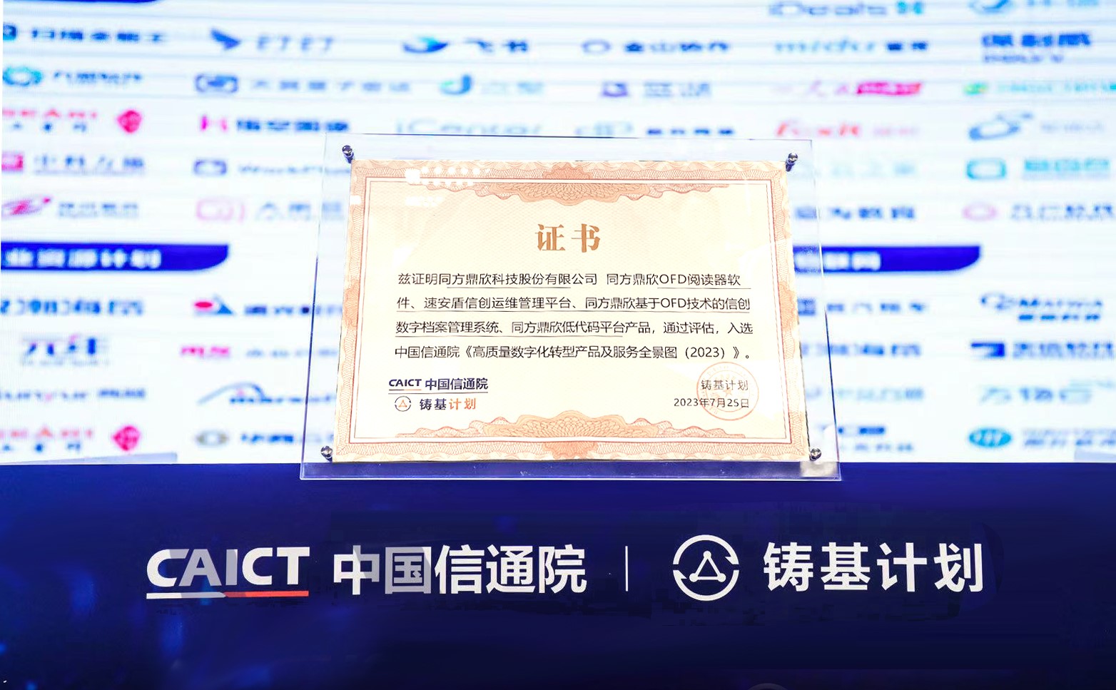 中國信息通信研究院是國家在信息通信領域(ICT)最重要的支撐單位以及工業和信息化部綜合政策領域主要依托單位,在國際國內信息通信行業具有很高聲譽和影響力。本次大會期間,中國信通院隆重發布了《高質量數字化轉型產品及服務全景圖(2023)》, 同方鼎欣憑借在產品創新、數據安全、互聯互通、服務質量、用戶體驗等多方面的優異表現和助力企業數字化轉型方面的實踐成果,成功入選,同方鼎欣OFD閱讀器、速安盾信創運維管理平臺、同方鼎欣基于OFD技術的信創數字檔案管理系統和同方鼎欣低代碼平臺分別收錄進全景圖:“通用辦公”板塊、“IT運營維護”板塊、“人力資源”板塊和“技術開發”板塊,為推動我國企業數字化轉型高質量發展做出了有力貢獻!