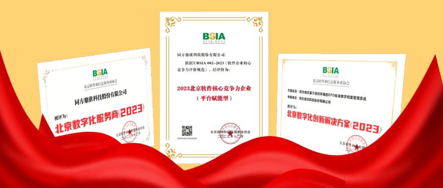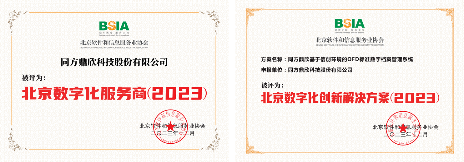 2023北京軟件企業核心競爭力評價企業”根據2020年修訂的新版《北京軟件企業核心競爭力評價規范》團體標準,以軟件企業綜合素質為基本要求,分別評選出平臺賦能型、技術研發型、市場應用型和業務探索型等4大類型企業。同方鼎欣再度獲評“2023北京軟件核心競爭力企業(平臺賦能型)及“北京數字服務商(2023)”,并以公司自主研發的“基于信創環境的OFD標準數字檔案管理系統”,獲評“北京數字化創新解決方案(2023)”。