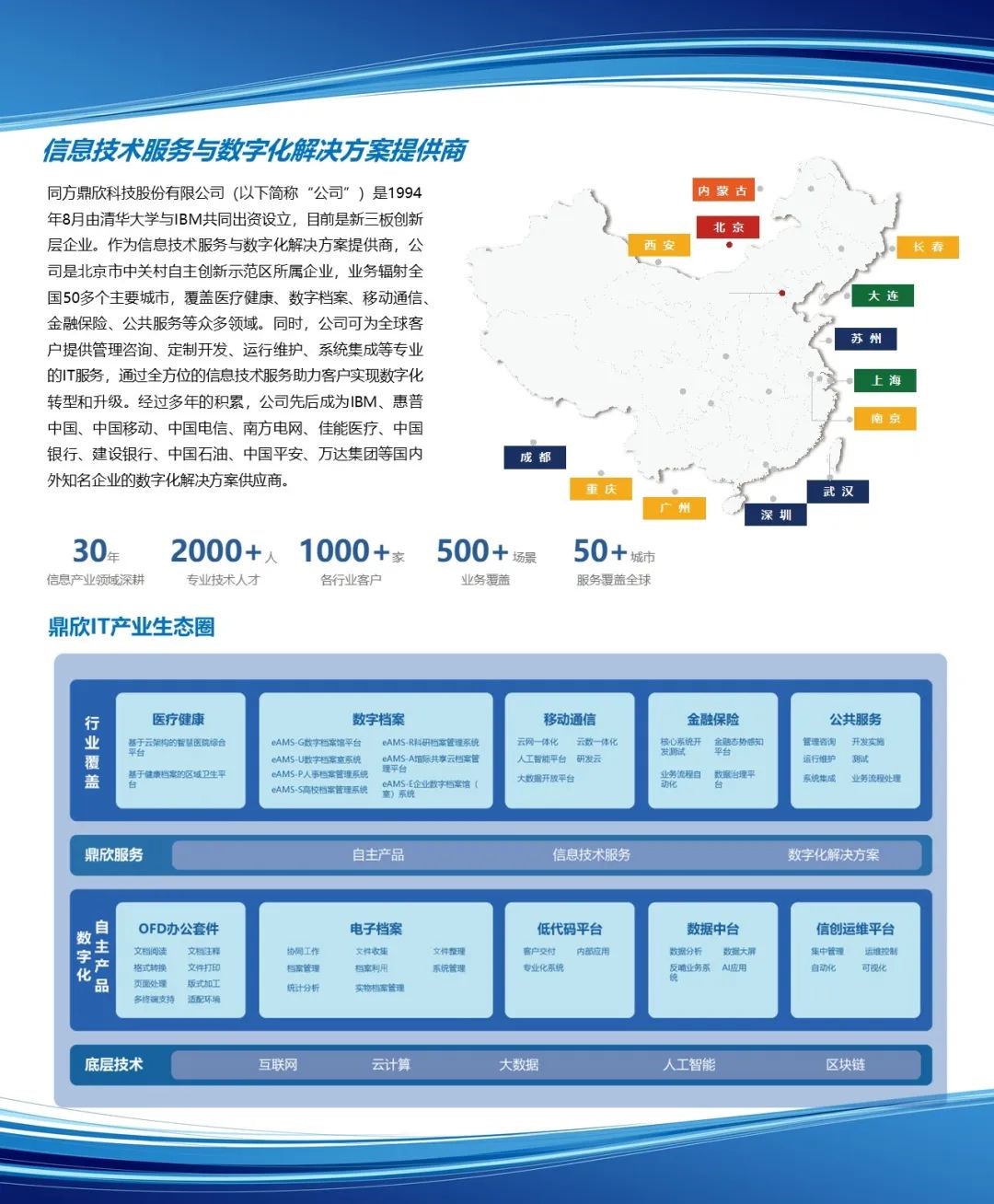 作為北京軟協理事會理事單位,成立于1994年的同方鼎欣深耕信息產業領域近30年,是我國推進行業數字化轉型的先行者之一,公司秉承“科技創新、服務社會”的宗旨,致力于成為中國領先的信息技術服務與數字化解決方案提供商。經過多年發展,現已成為覆蓋醫療健康、數字檔案、移動通信、金融保險、公共服務等眾多領域的解決方案服務商。可為全球客戶提供管理咨詢、定制開發、運行維護、系統集成等專業的IT服務,通過全方位的信息技術服務助力客戶實現數字化轉型和升級。公司先后成為IBM、惠普中國、中國移動、中國電信、國家電網、南方電網、佳能醫療、農業銀行、中國平安、中國石油、云從科技、第四范式、萬達集團等國內外知名企業的服務提供商。
