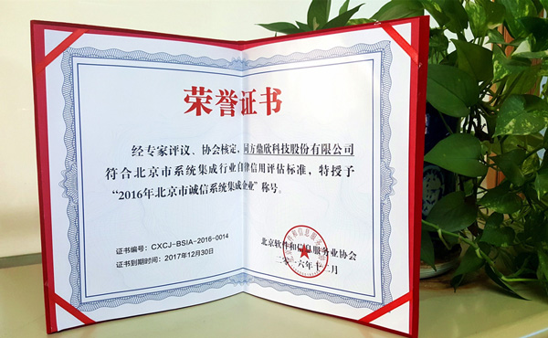 2016年北京市誠信系統(tǒng)集成企業(yè)榮譽證書