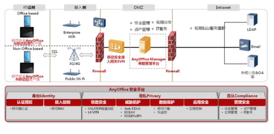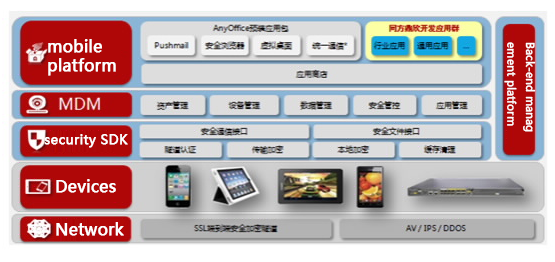 ASDC solutions adopt many aspects which include the mobile terminal security, network security, application security, sensitive data security, and security management etc to protect All-round for mobile office, helping enterprises find the careful balance between BYOD high degree efficiency and information security. Network diagram as following: