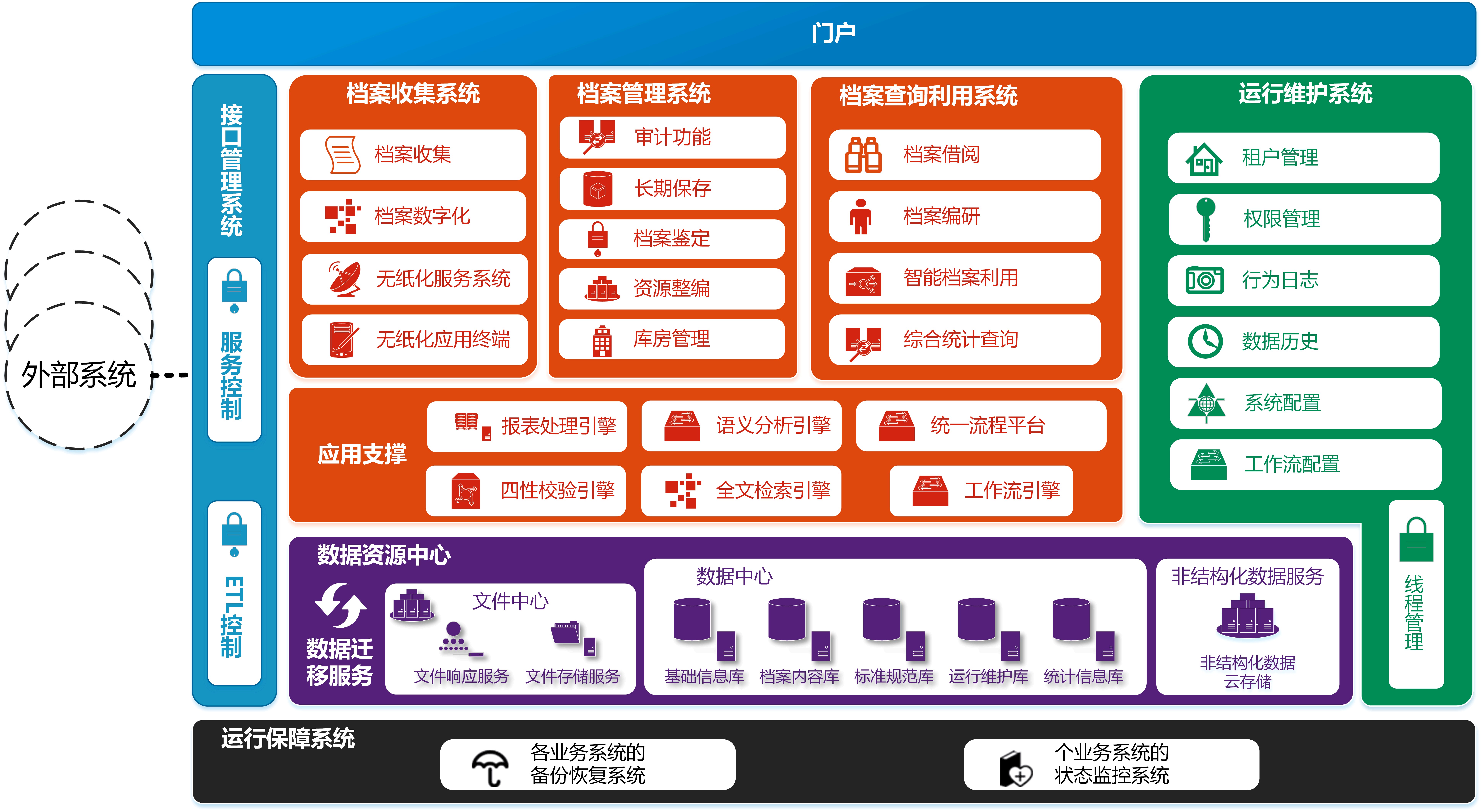 產品按照用戶不同行業分為省級數字檔案綜合共享利用平臺、綜合性檔案館、省級立檔單位、地市級立檔單位、集團性企業、紀檢行業、通信行業、高校教育等行業版本。系統集成了電子文件及其元數據捕獲、收集整編、室藏檔案、歸檔審核、查詢利用、跨館出證等各大功能。