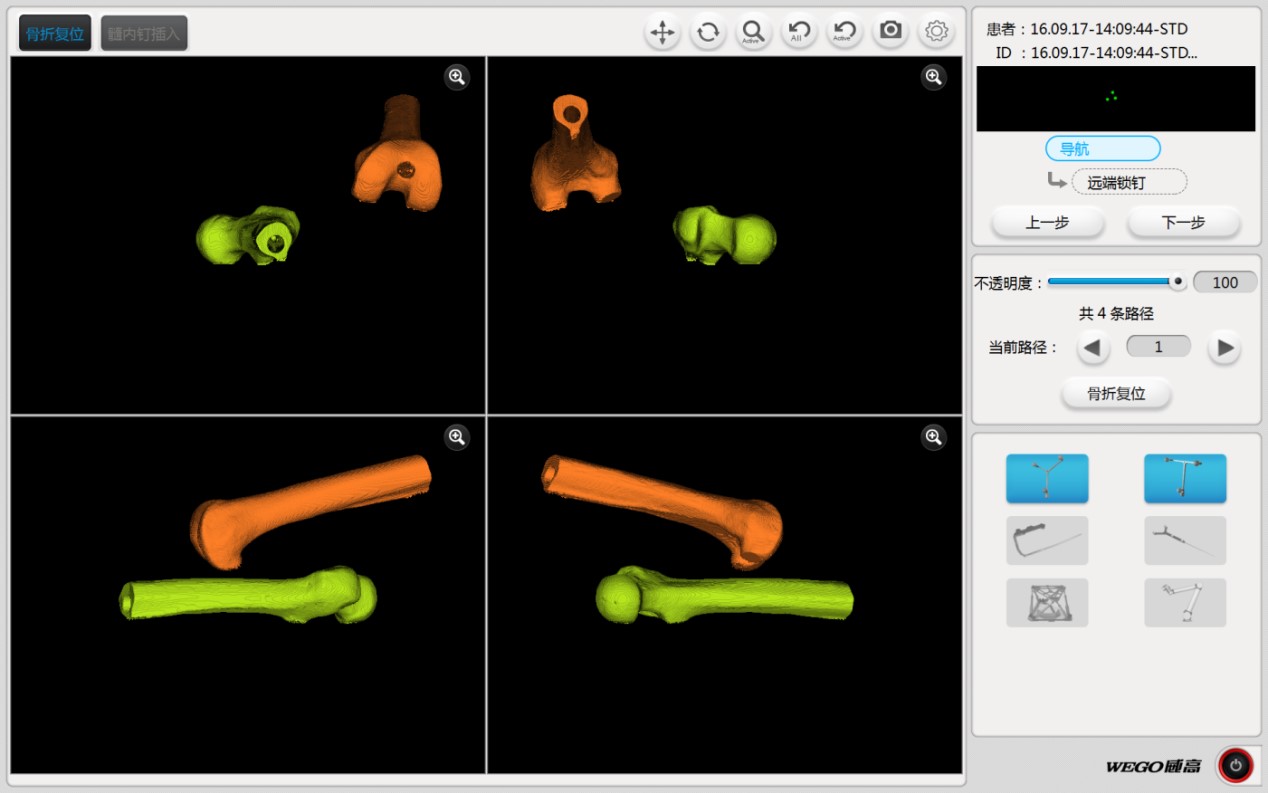 進入實時導航模式時,系統將提前規劃的復位路徑指令傳遞給復位機器人。導航軟件中規劃髓內釘入釘點方位,將指令發給定位機器人,機器人自動指示入釘點方位,外科醫生置入導向套筒,電鉆打入克氏針,置入股骨髓內釘。導航軟件中規劃髓內釘遠端鎖釘方位,將指令傳遞給定位機器人,機器人自動指示鎖釘方位,外科醫生置入導向套筒,電鉆打入克氏針,置入遠端鎖釘。對骨折復位操作進行自動路徑規劃和預覽,確保復位過程不會發生骨骼間的碰撞。