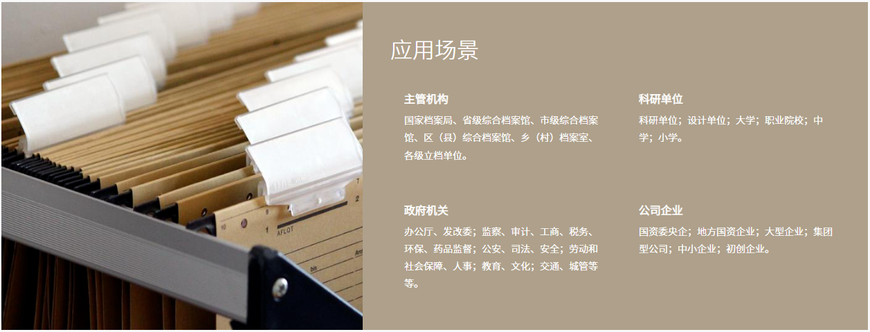 公司深耕檔案信息化領(lǐng)域,構(gòu)建安全、自主、可控產(chǎn)品,依托國產(chǎn)化生態(tài)環(huán)境推動(dòng)人工智能、區(qū)塊鏈、大數(shù)據(jù)和云計(jì)算等技術(shù)的創(chuàng)新運(yùn)用,為各省市檔案局館、高校、科研院所、政府機(jī)關(guān)、企業(yè)集團(tuán)等提供檔案咨詢及數(shù)字檔案館室/智慧檔案館/集成工程的建設(shè)與數(shù)據(jù)分析檢測(cè)、檔案SaaS平臺(tái)等全產(chǎn)業(yè)鏈檔案信息。