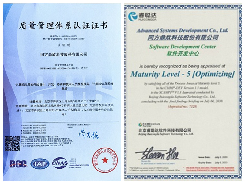 同方鼎欣于1999年通過了CMM L2的評估,是國內第一家通過CMM評估的企業,自2005年公司首次獲得ISO9001質量安全認證以來,公司業務運營遵循著制度化、規范化、體系化的管理模式。公司圍繞質量、環境以及職業健康安全建立了管理制度、操作程序文檔及記錄,嚴格實現了對內嚴控質量安全、建立風險管控機制,不斷推進質量標準體系建設,對外以國家標準、行業標準為核心,確保服務和產品高質量交付,實現穩定的可持續發展。公司于2020年7月順利通過CMMI 5級評估,并將CMMI5級的各項標準應用到項目管理及應用開發的各個環節,一如既往地堅持對產品質量和過程改進的關注,并會將量化管理的思想融入企業管理和運營中,支持企業在研發管理、產品質量和過程能力上的全面提升,不斷革新技術、迭代產品,推出更成熟的解決方案和服務,助力客戶數字化轉型。